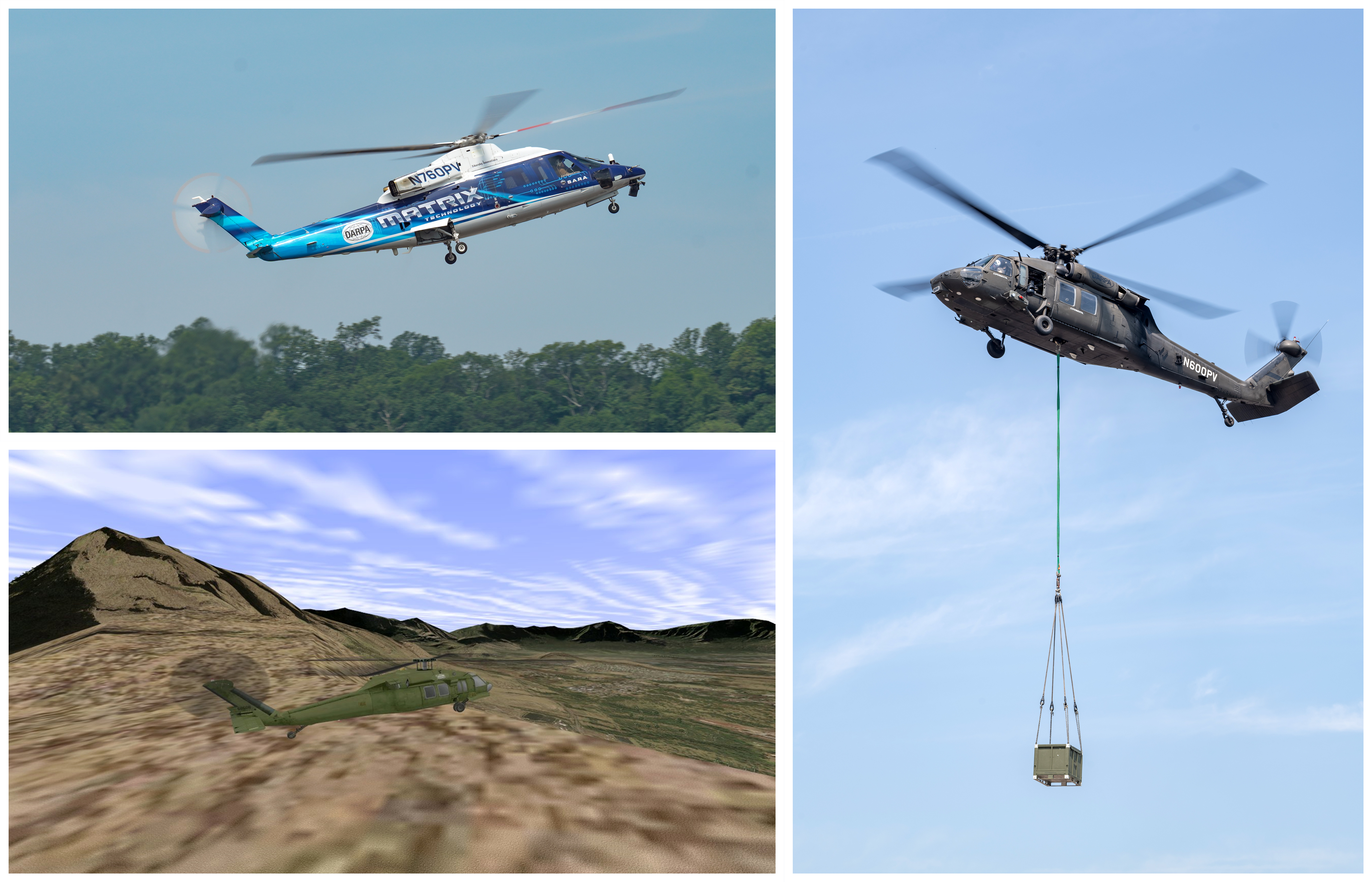 Two Sikorsky helicopters equipped with the MATRIX autonomy system demonstrate autonomous and autonomy-assisted missions for the U.S. Marine Corps’ Aerial Logistics Connector program. Lower left, a simulated autonomous landing in mountainous terrain. (Click the image for a high resolution version.)