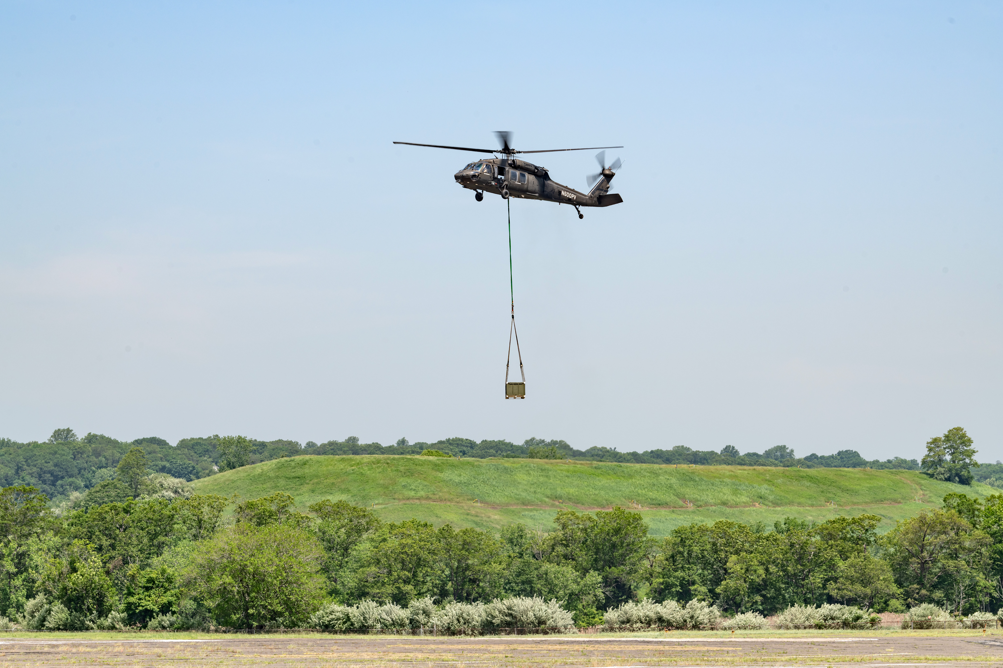 The optionally piloted Black Hawk helicopter flies with a sling load in full autonomy mode during the ALC demonstration at Sikorsky’s Stratford, Conn., HQ. (Click the image for a high resolution version.)